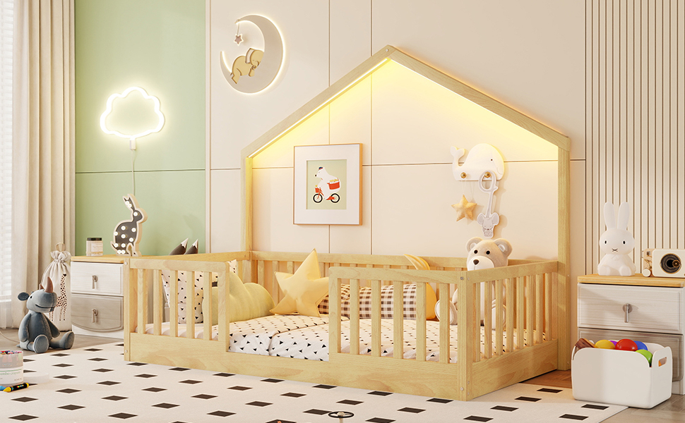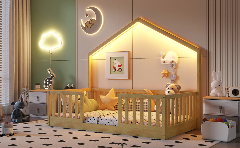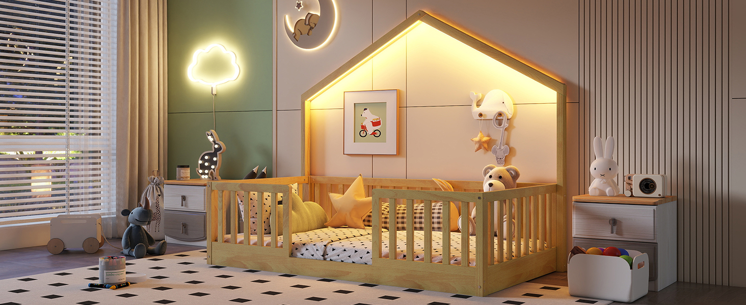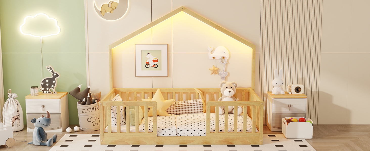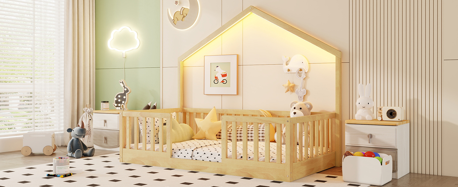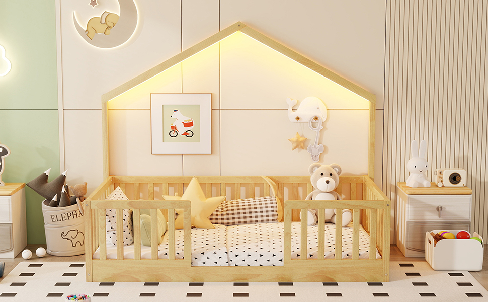 - Floor Bed with LED Light: This twin size floor bed with simple house shaped and included LED strip lights to create a cozy, dreamy atmosphere for bedtime. P.S. The light only have 1 color, can’t change in different colors.