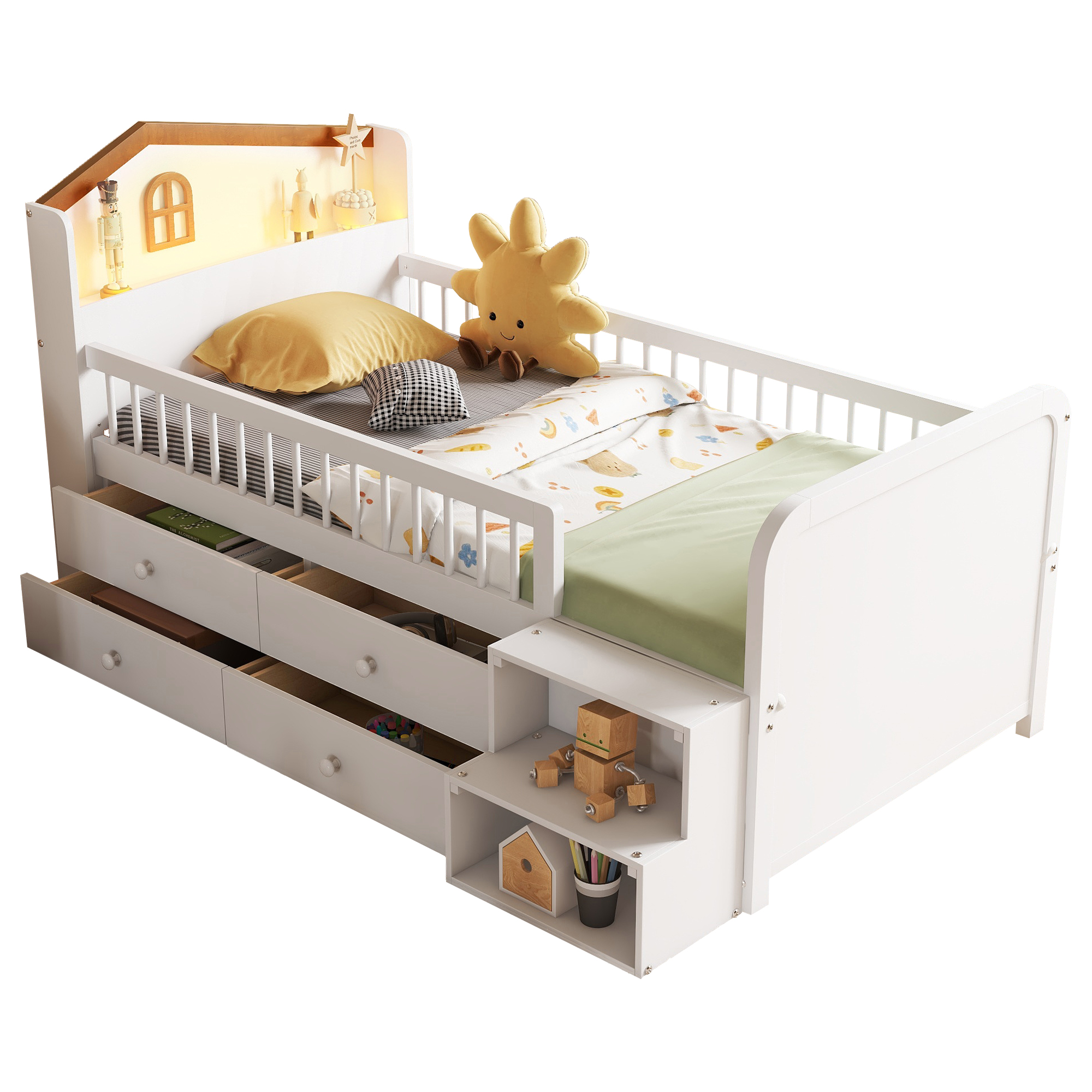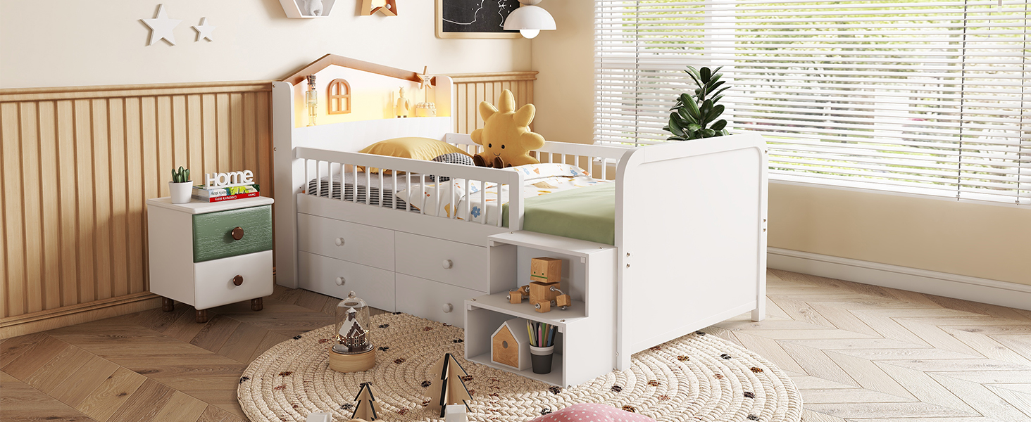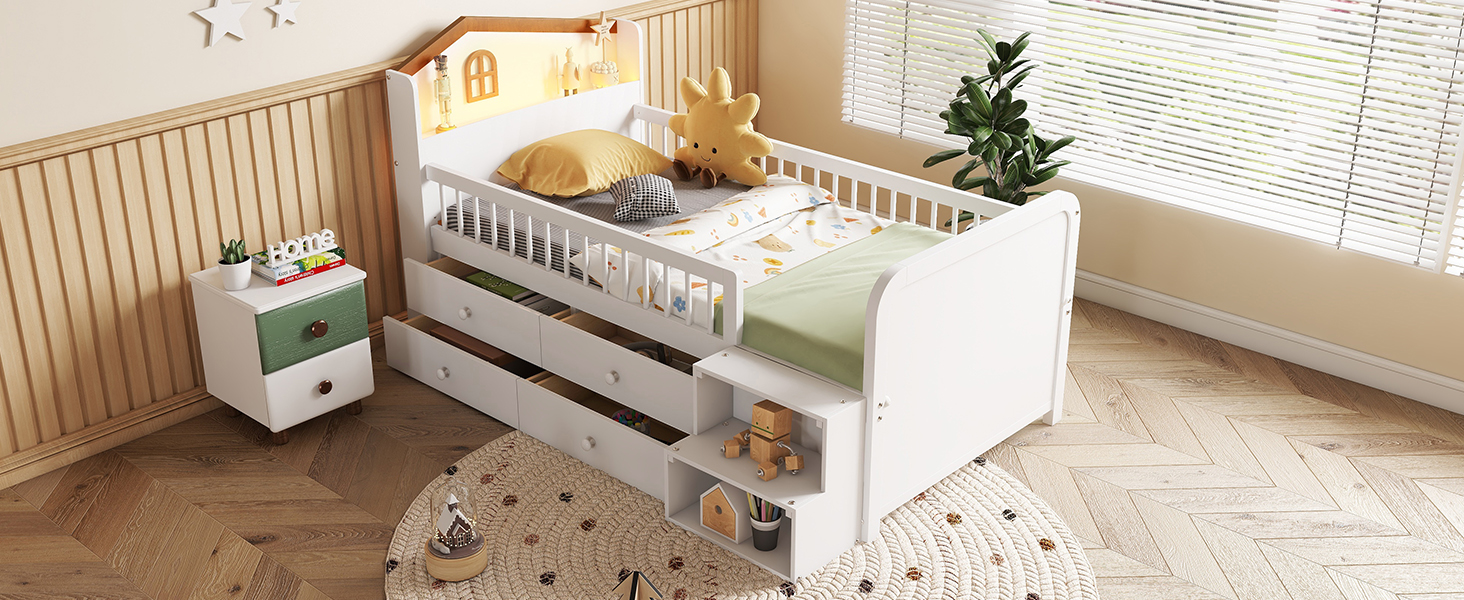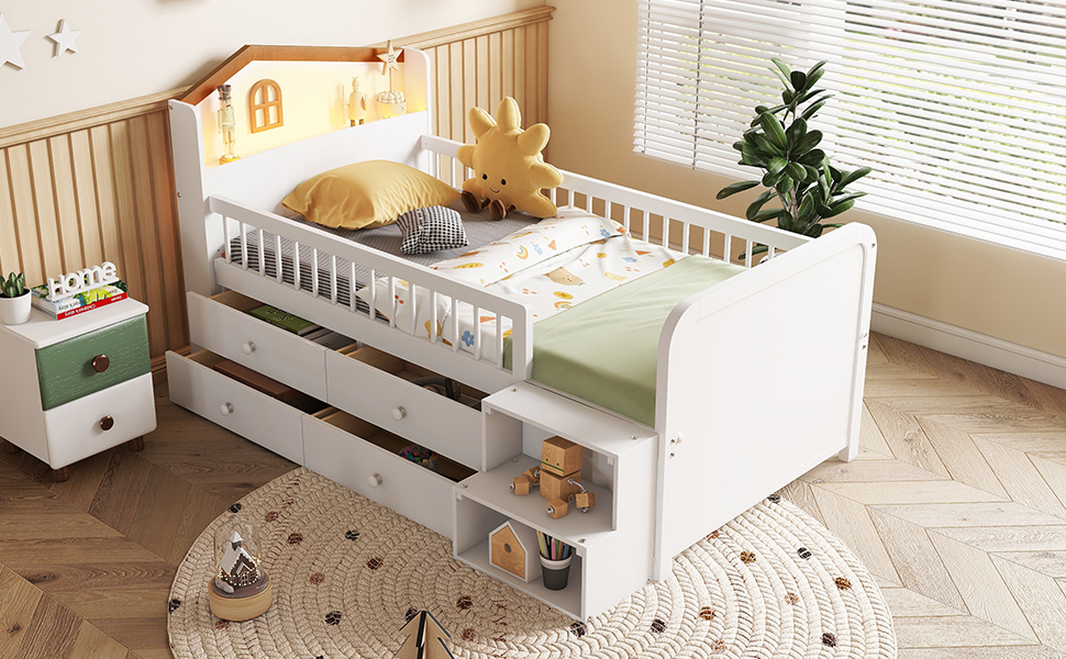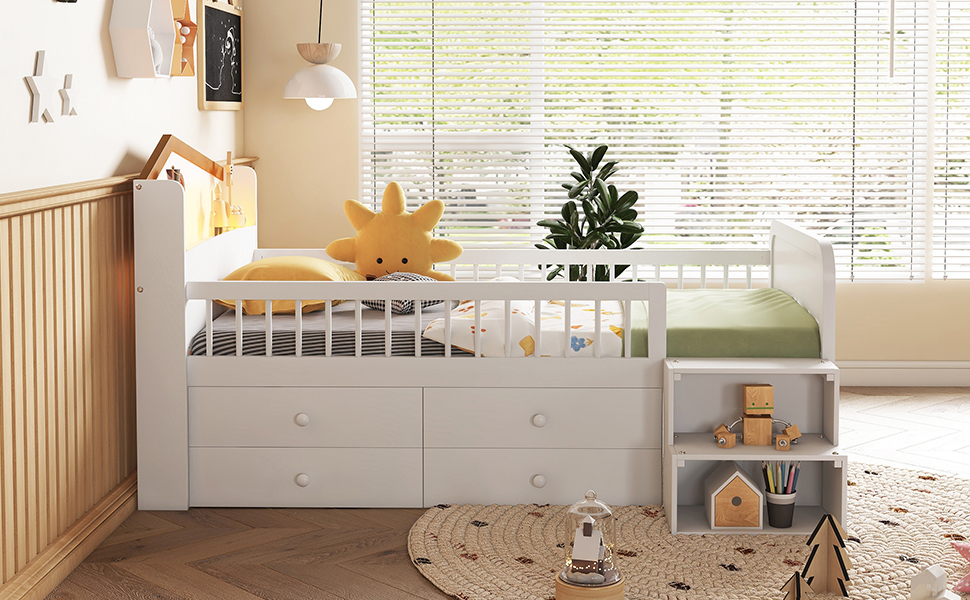 - [Kids Loft Bed with Storage Drawers]: The low loft bed takes up minimal space for your bed room. 4 underside storage drawers perfect for organizing clothes and other belongings, maximizing the use of space in the bedroom and help keep space tidy and organized.