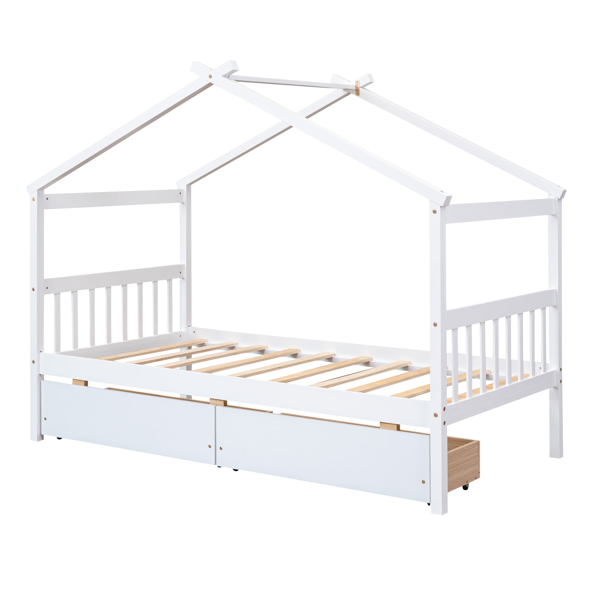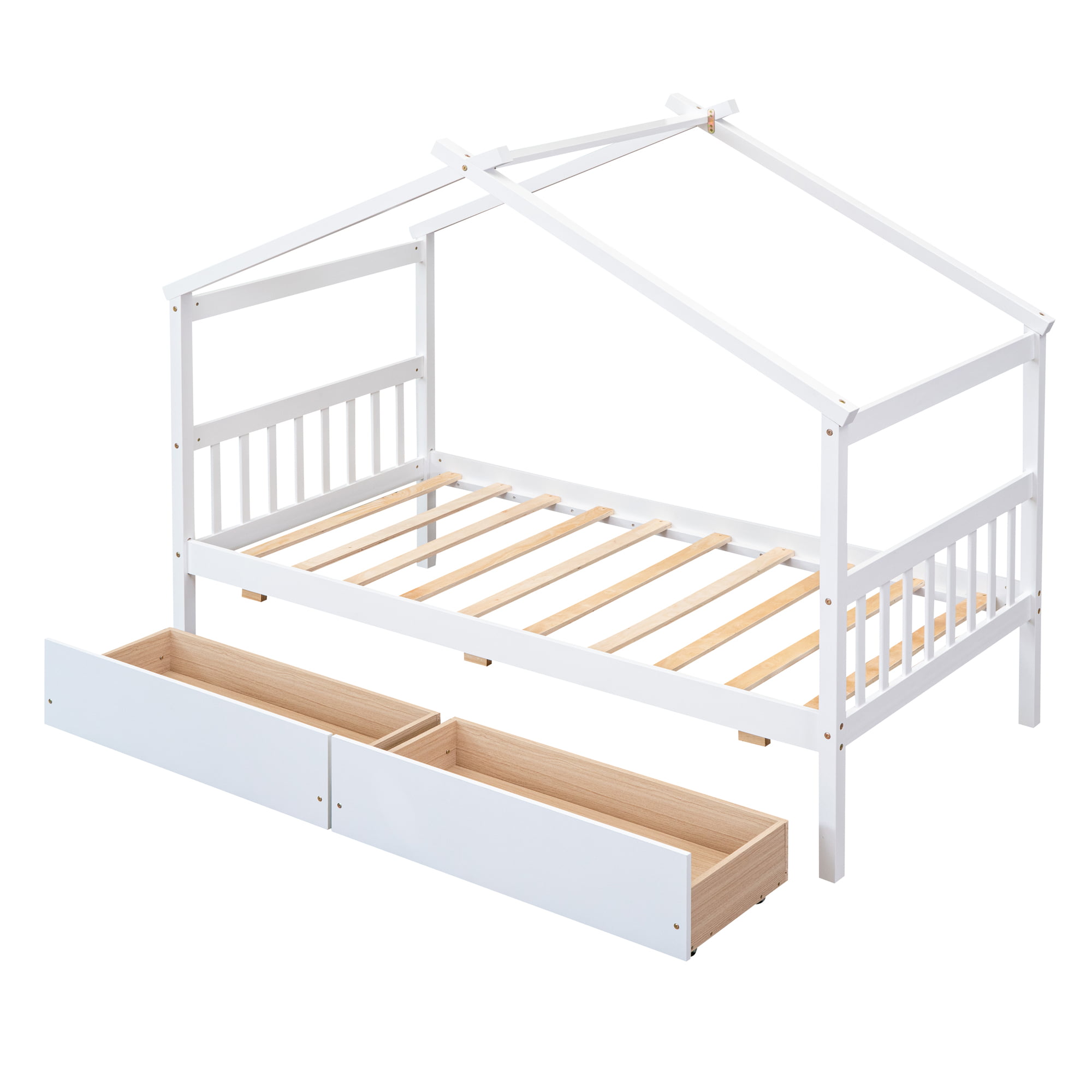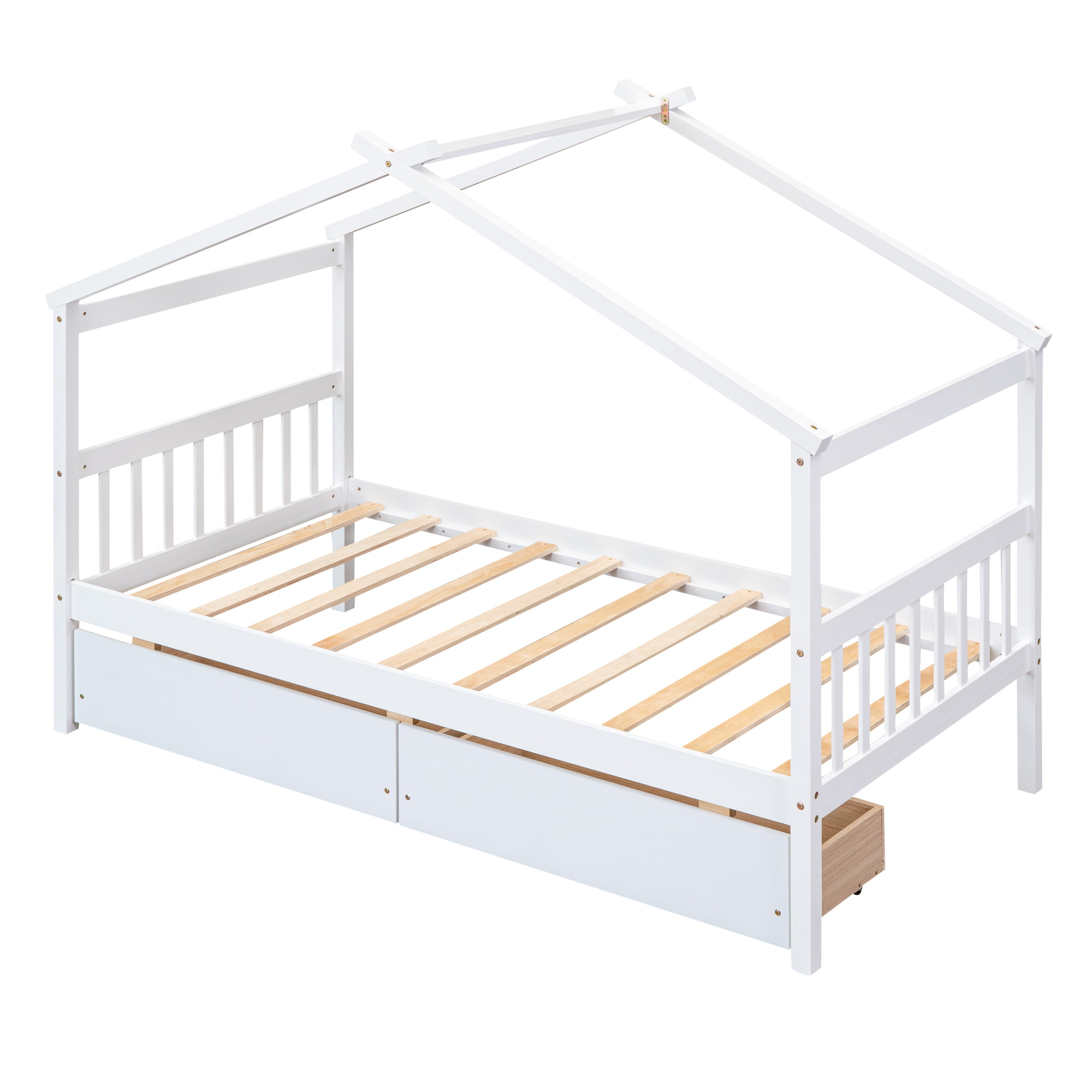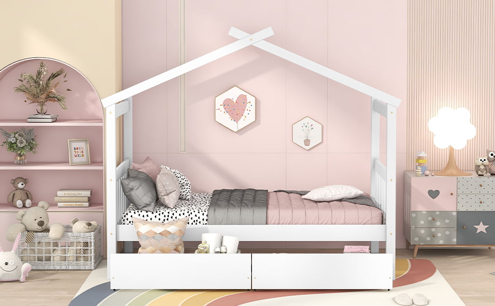 Wooden Twin Size House Bed With Drawers