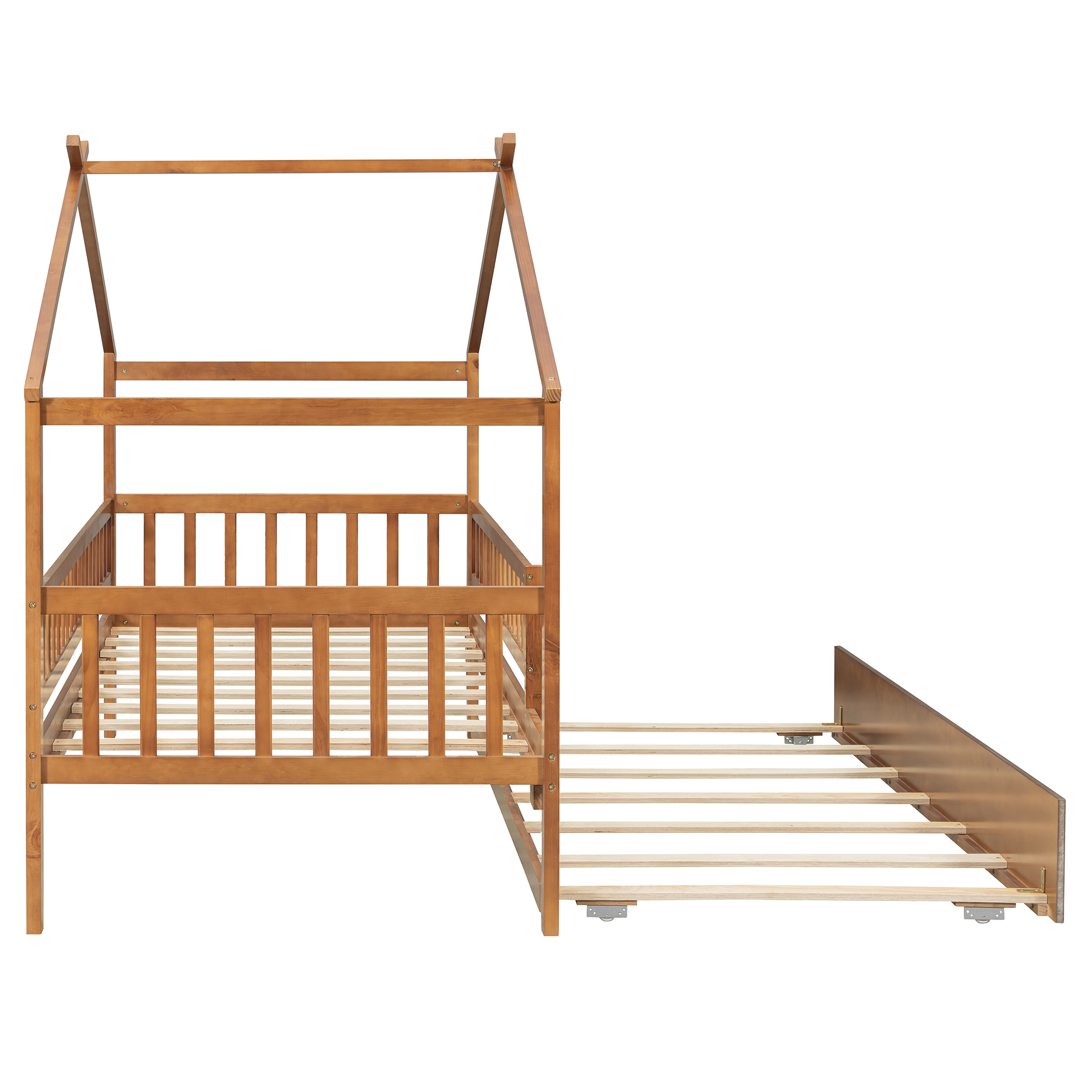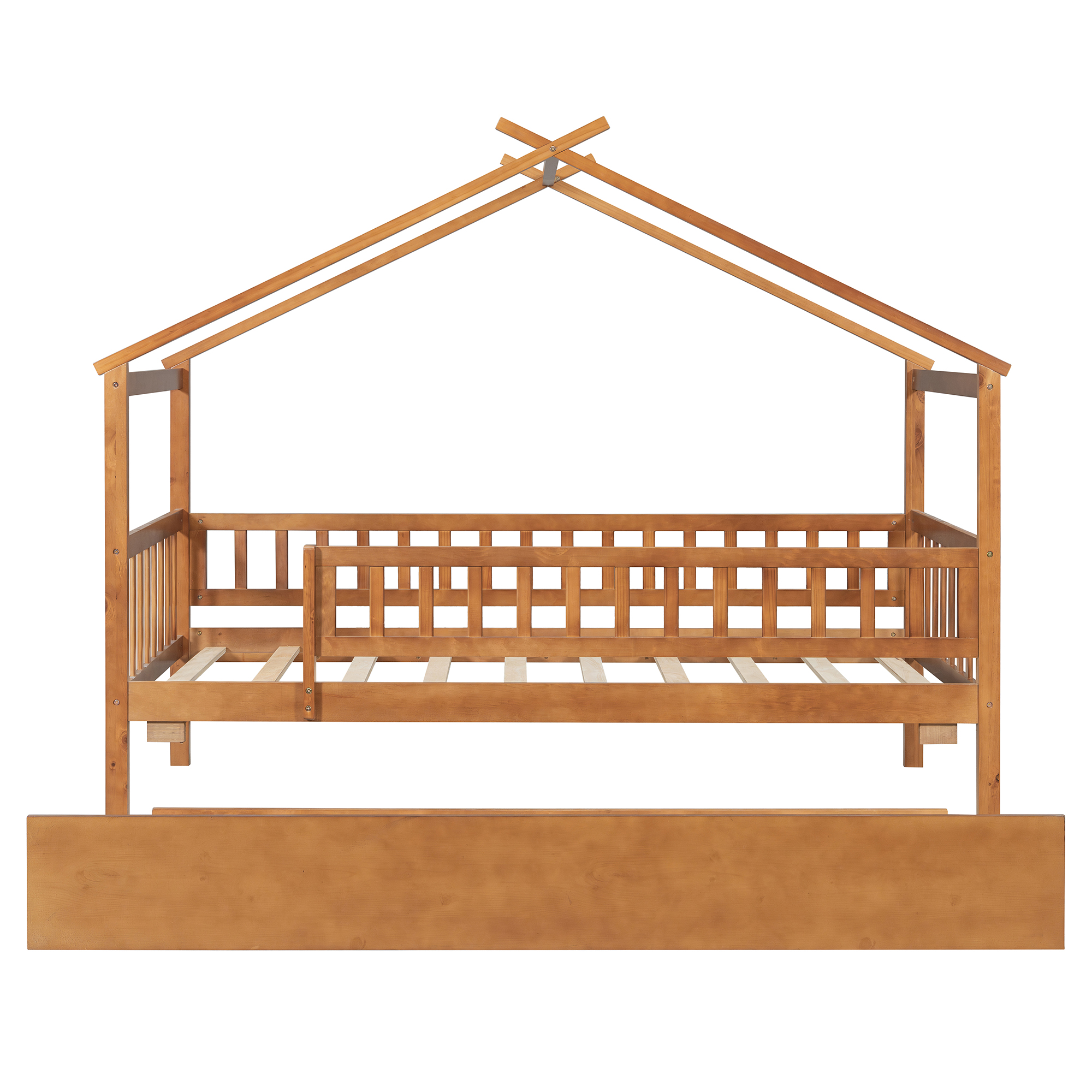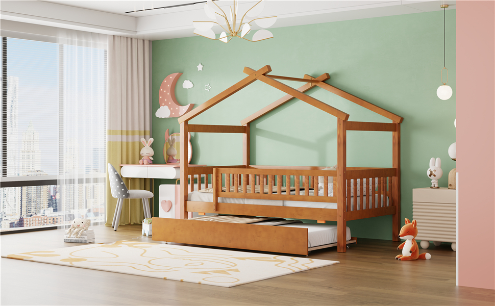 - [Spacious Storage] The wood house platform bed with trundle offer extra sleeping space for sleep-over. Simply just roll out when needed and roll in when it’s not in use. It’s a perfect space-saving solution to you.