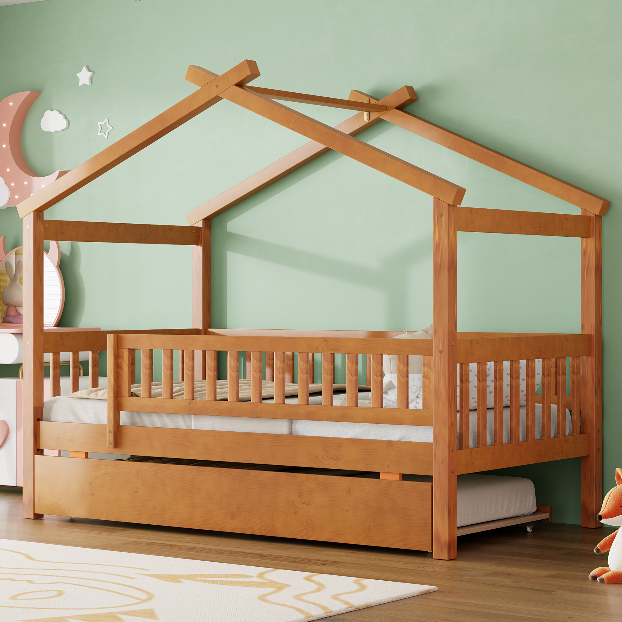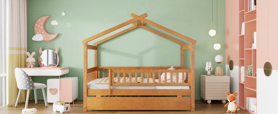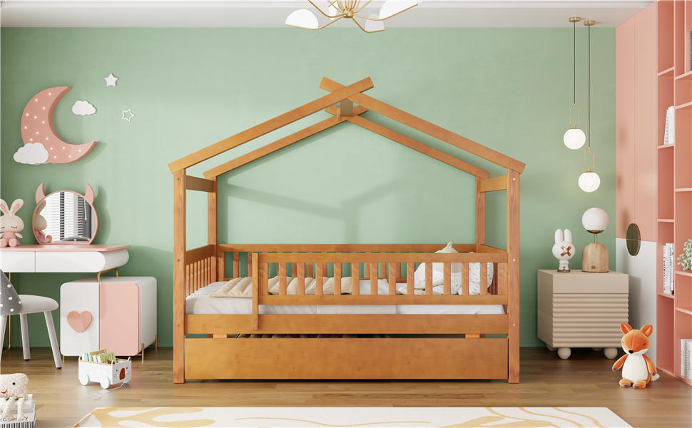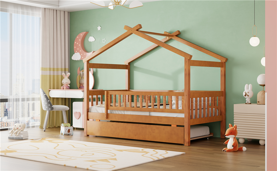 - [Creativity House Bed] The kids house bed featuring a classic house-shape, this imaginative bed is equipped with a whimsical sky roof for a fun bedroom environment that your child will love.