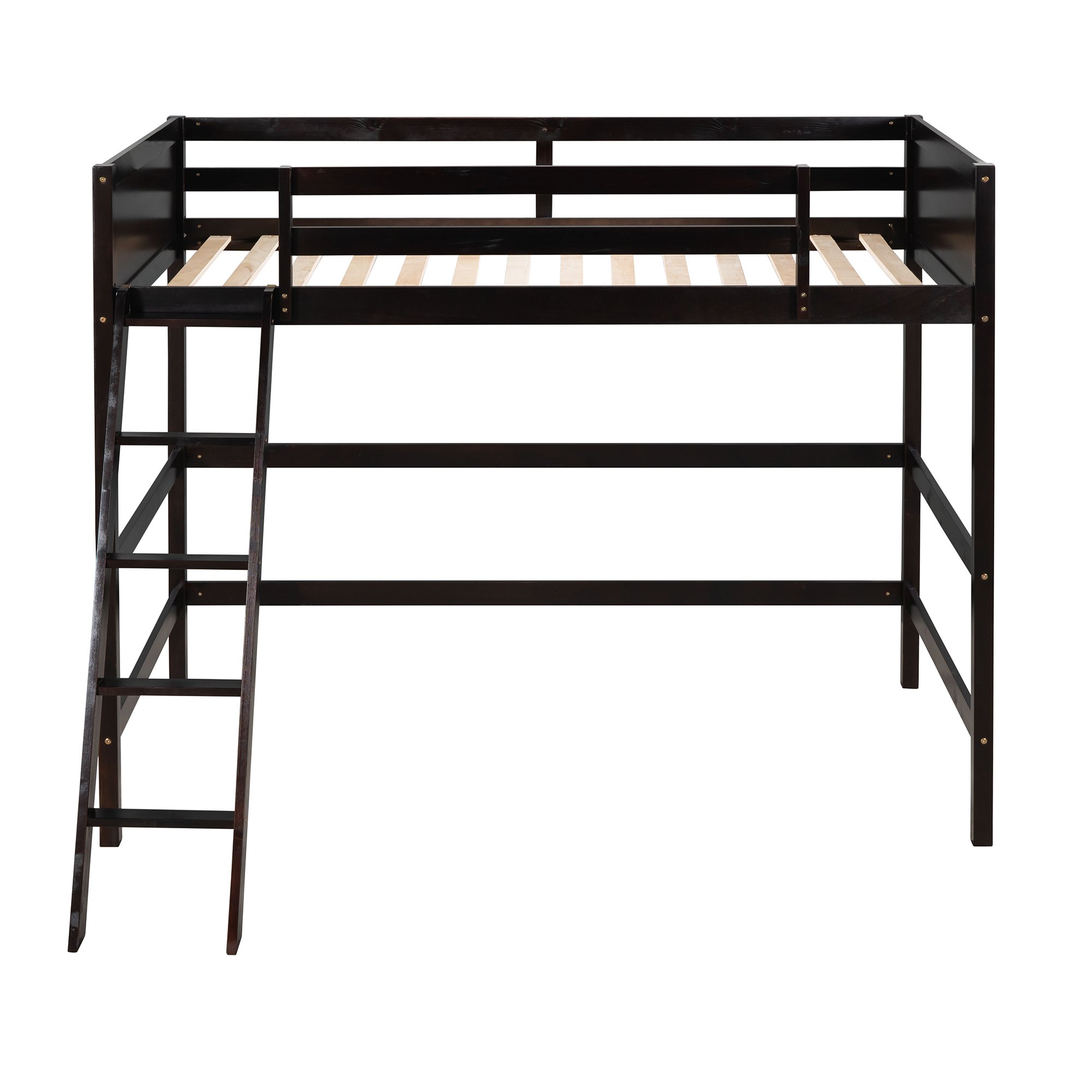 - [Stability] Fourteen evenly spaced and solid wood slats blend naturally into the already sturdy frame to give added ground-up support that provides stability. The loft bed features guard rails for added safety, and is accessible via the sturdy, slanted ladder. Enjoy many long years of relaxation and family fun, secure in this meticulously designed wood platform bed.