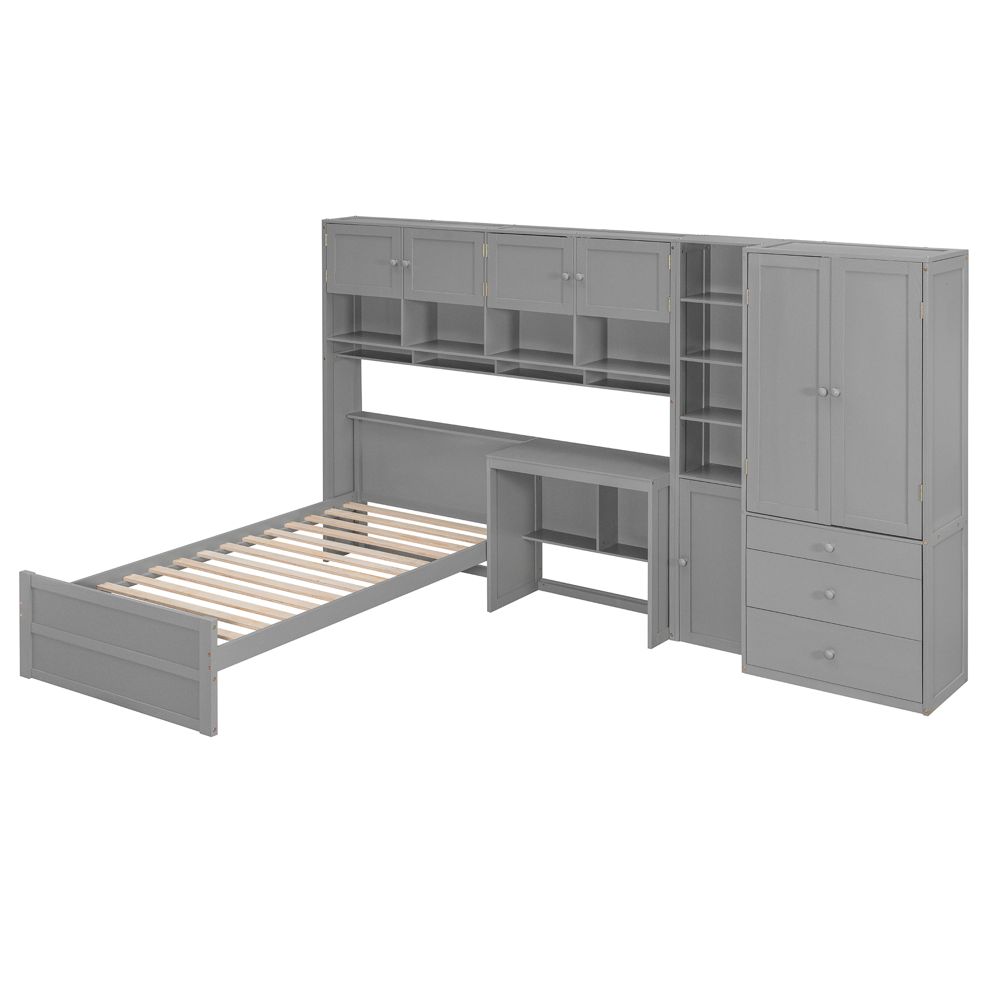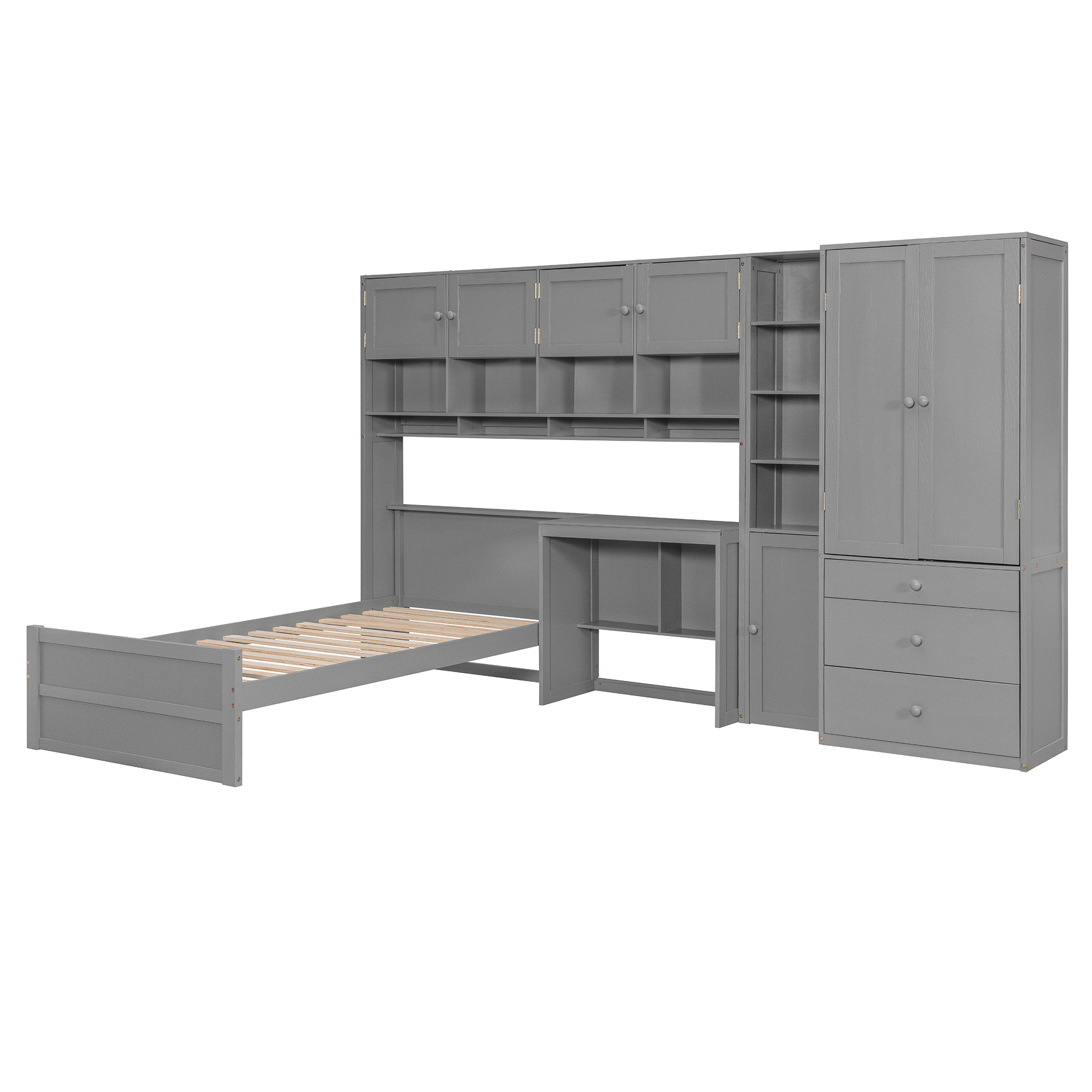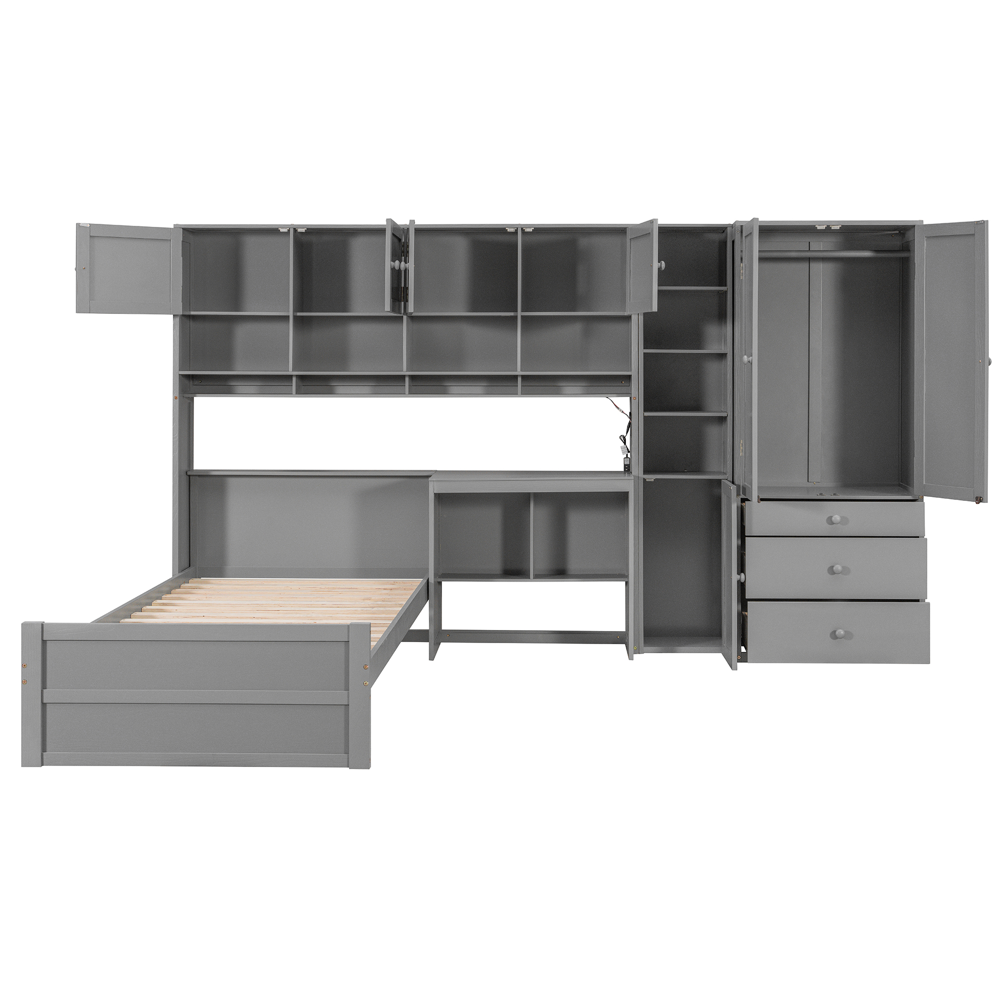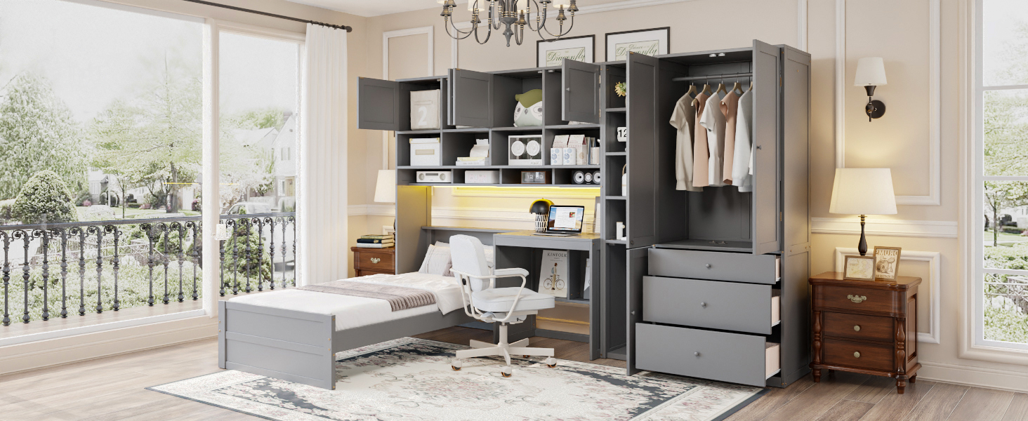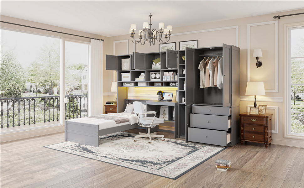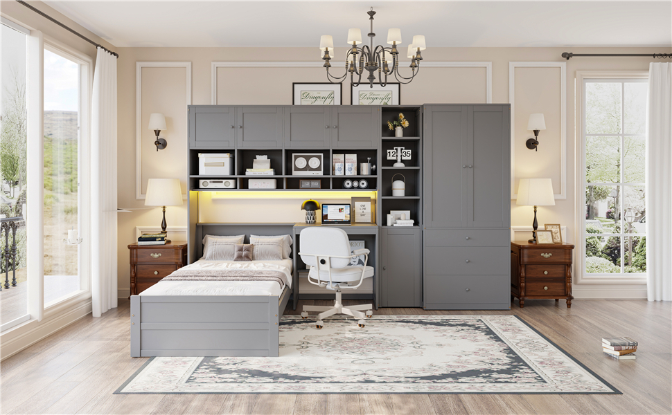 - [Multifunctional Design] This wooden twin size platform bed features a built-in desk with an LED light strip above the desk, adding a modern touch to your bedroom. It also includes 3 drawers, and multiple cabinets and shelves to help you organize your belongings efficiently.
